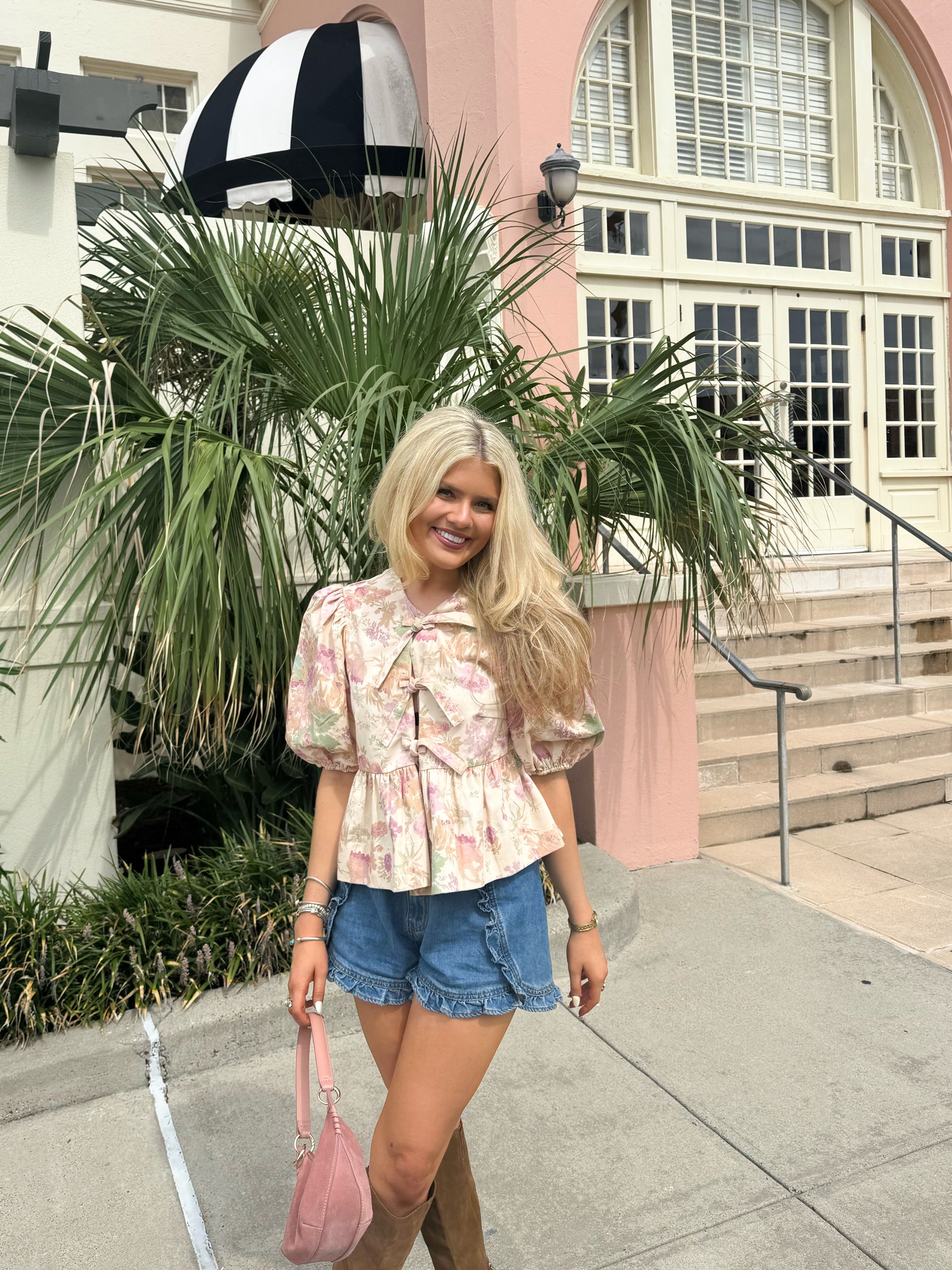 Introducing our Cecilia Tie Top! Featuring an elegant floral pattern, delicate front ties, and feminine puff sleeves, this top is the perfect blend of charm and style. Dress it up with a skirt for a night out or pair it with denim for a chic everyday look.