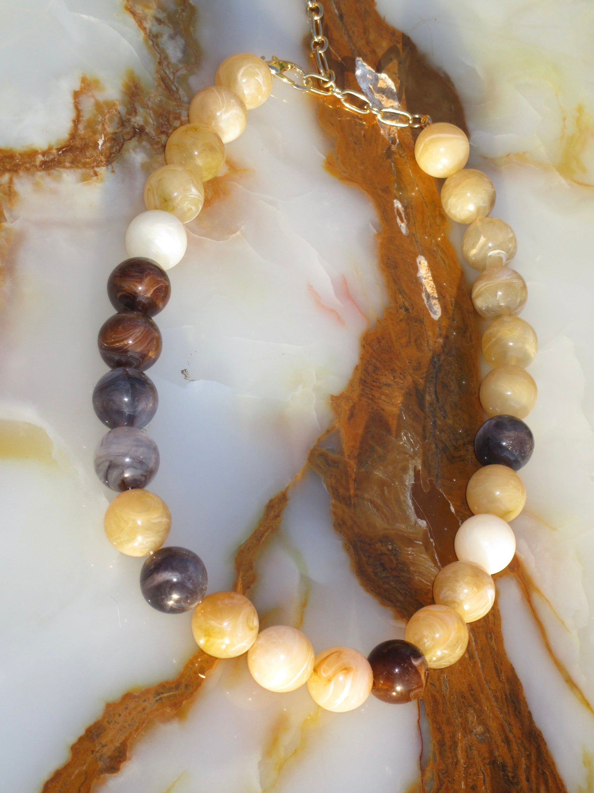 Featuring round marbled beads in warm browns, creams, and smoky grays, this necklace is finished with a gold chain extender for an adjustable fit.