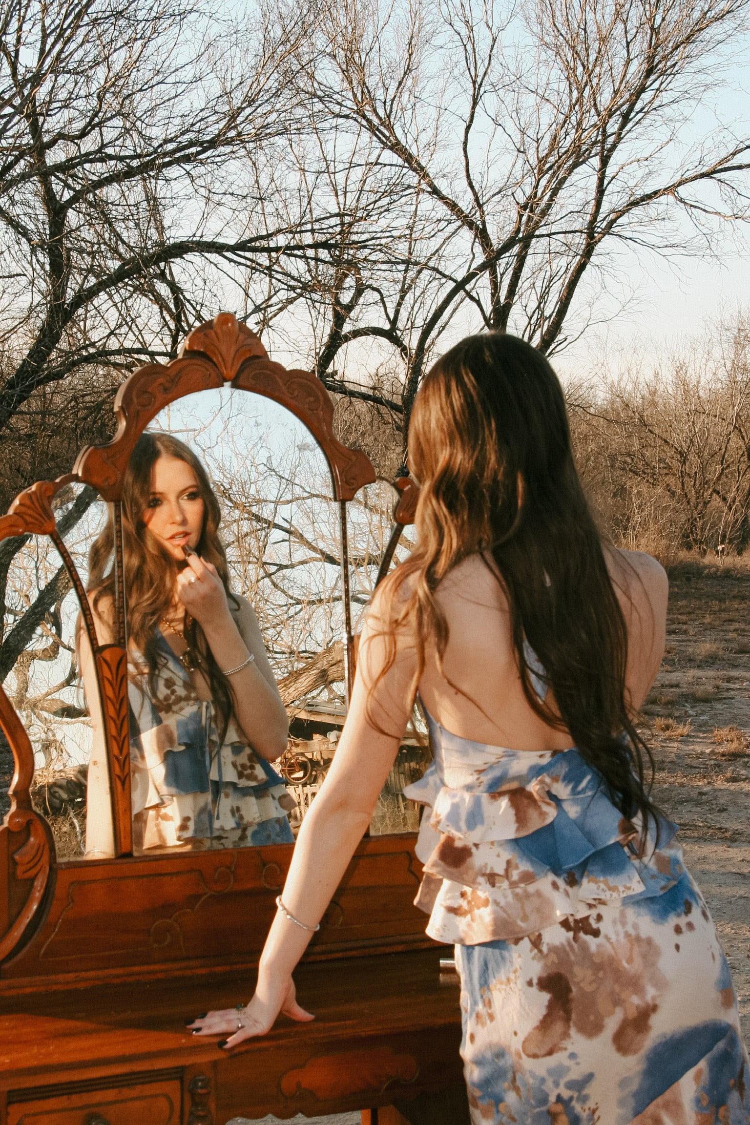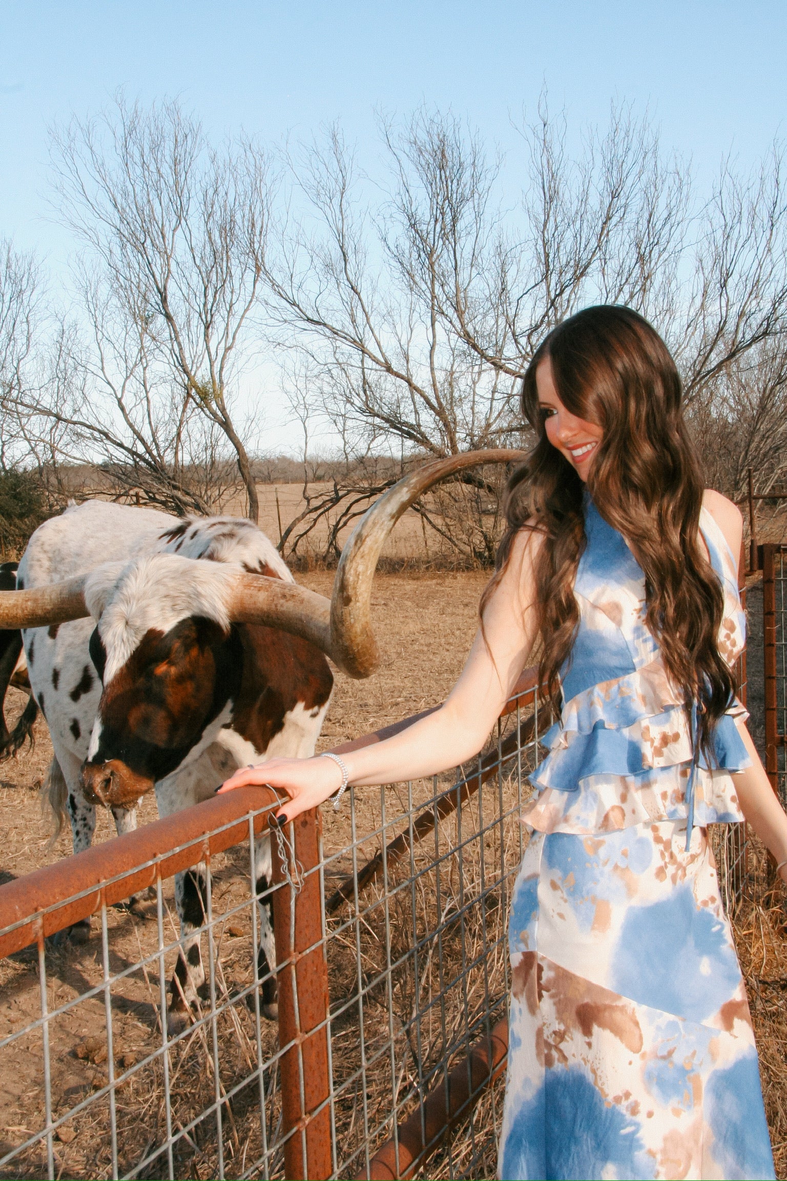A statement set that speaks for itself — The Jennings Set! Featuring a blue and brown tie-dye print top with a front tie and halter tie neckline, paired with a matching maxi skirt and tan western belt, this look was made to start conversations. Wear it together for a bold, effortless statement or style the pieces separately for endless standout looks.