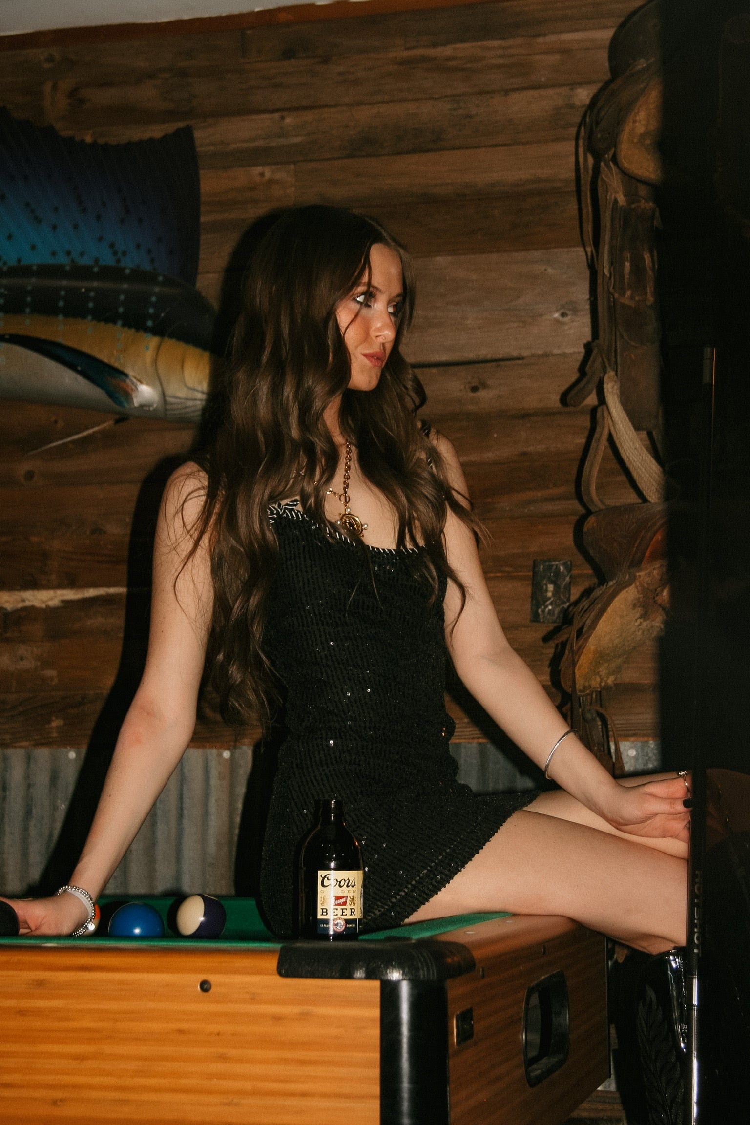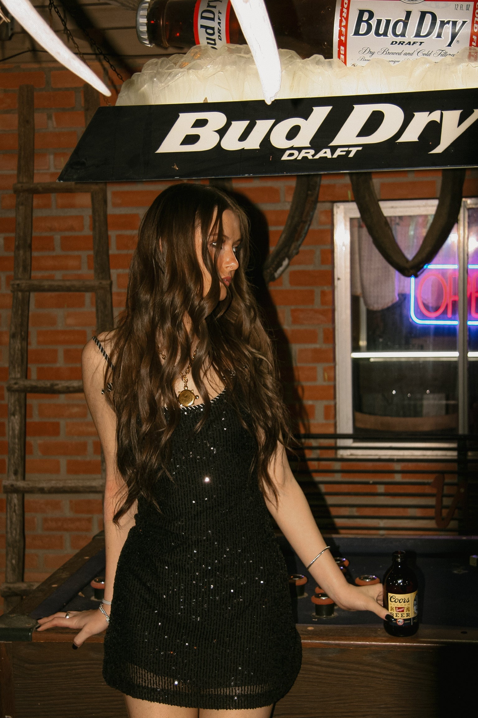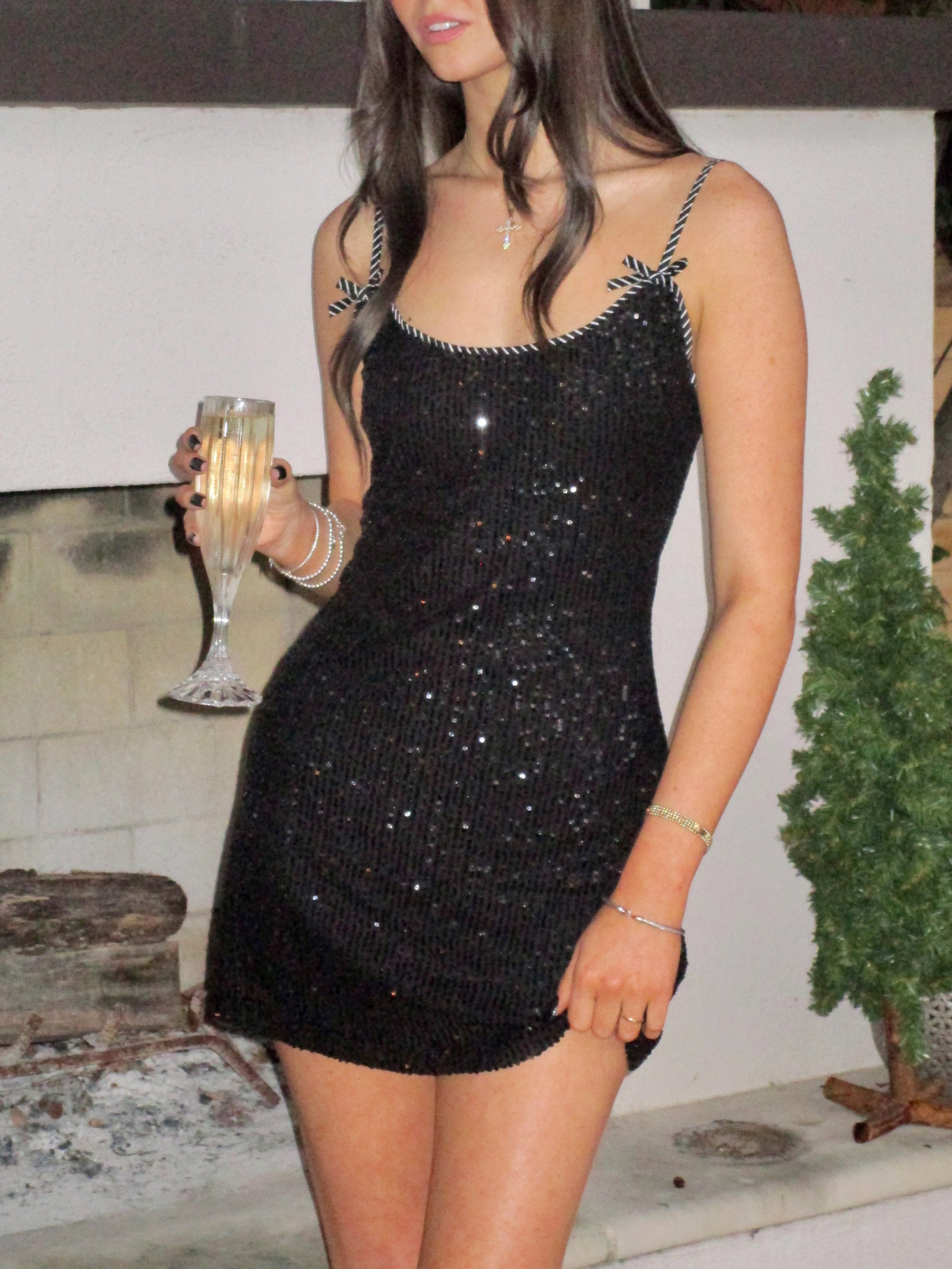 The Midnight Mini is sure to impress! Featuring a black sequin fabric with back zipper closure and stripe detailing along the hem with bow accents on the adjustable straps, this dress is the perfect choice for nights out, holiday parties, or any occasion that calls for a little extra sparkle!